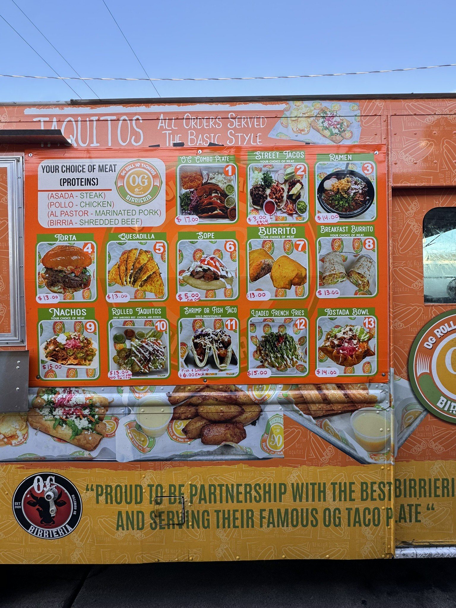 OG Roll Up Taquitos partners with OG Birreria, serving delicious birreria (as well as asada, pollo, and al pastor) out of their colorful food truck. In addition to taquitos, they offer traditional taco truck items: tacos, burritos, nachos, sopes, and more.